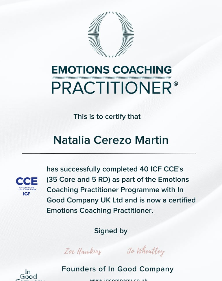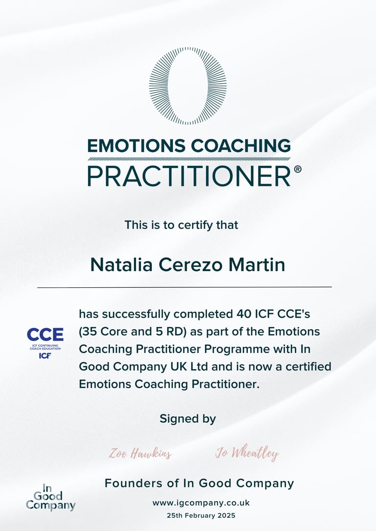 I’m Natalia Cerezo Martin, a Spanish executive and leadership coach and emotions coaching practitioner. My sessions are energising, steady and challengingly kind. We name the feeling, then choose the move that fits your values and goals. Clients leave clearer, braver and accountable.